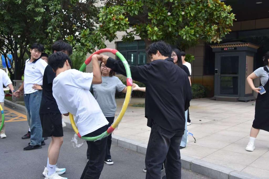 活动精心设计了“一圈到底”和“心心相印”两个趣味环节。“一圈到底”环节要求每支队伍由6名成员组成,手拉手形成一个圆圈,在不松手的情况下协作传递呼啦圈,完成两轮循环计时。这一环节极大地考验并锻炼了团队成员之间的默契程度与协作配合能力。而在“心心相印”环节中,两人组成搭档,需用肩头共同夹住一张A4纸,在保证纸张不掉落的前提下完成20米折返跑。这一设计让同学们在紧密协作中深刻感受到了彼此信任的力量。