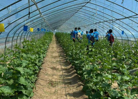 随后,同学们来到智慧农业大棚参观哈密瓜的种植状况。在这里,同学们系统了解了哈密瓜的完整生长周期与种植方法,讲解人员详细介绍了智慧农业大棚在环境调控、病虫害防治及提升作物质量方面所发挥的关键作用。