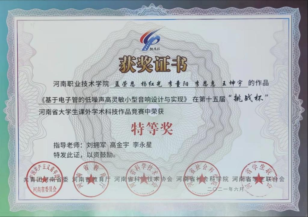 获奖证书——第十五届“挑战杯”《基于电子管的低噪声高灵敏小型音响设计与实现》项目,获得了国赛三等奖、省赛特等奖的公司最好成绩。