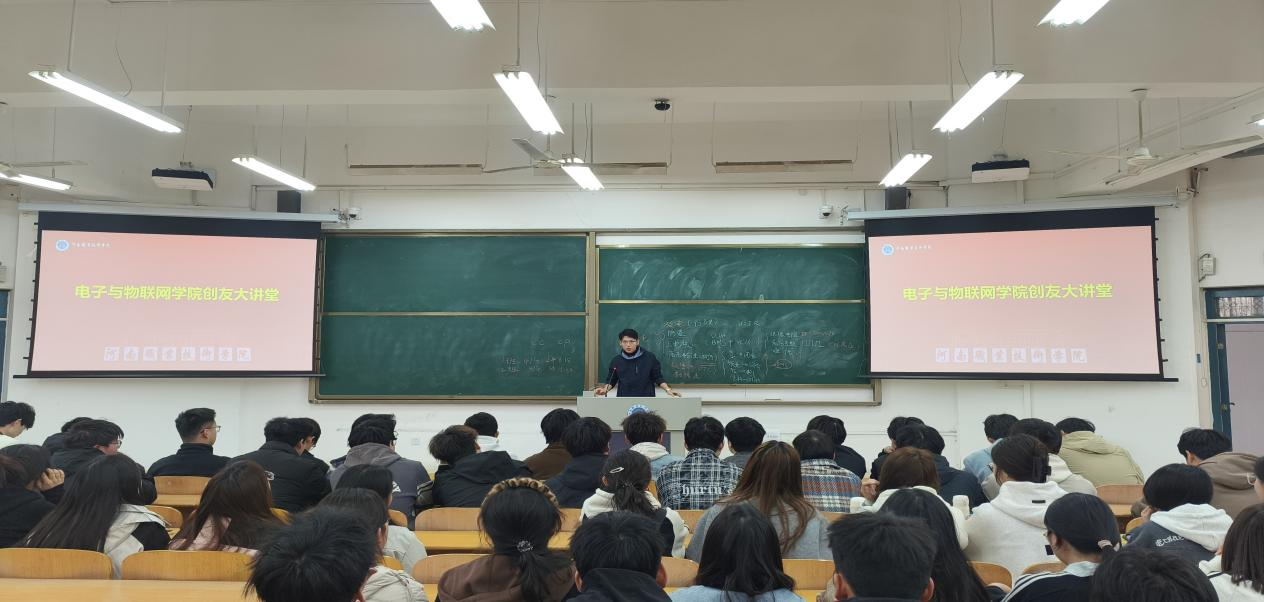 在分享过程中,孟荣恩结合自身经历,从创新创业参赛经历讲起,详细阐述了项目从选题、技术研发、团队协作到最终参赛的全过程。“一个好项目,不仅要有创新性,更要解决实际问题。”孟荣恩说。他鼓励同学们要敢于尝试,勇于创新,将专业知识与实际问题相结合,找到自己的兴趣点和突破口。